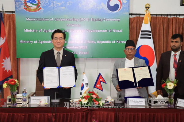 네팔을 방문한 정황근 농림축산식품부 장관은 이날 베두람 부살 네팔 농림축산개발부 장관과 만나 한-네팔 농업협력 양해각서(MOU)를 체결하고 네팔에 한국의 농업기술을 전파하는 한편 공공·민간 교류를 강화하기로 했다.